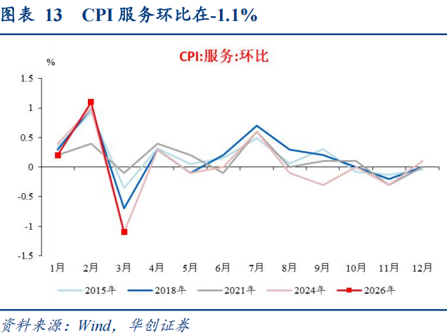(3)服务:价格超季节性回落,影响CPI下行约0.54pct。长假过后消费需求季节性回落较多,加之节后部分服务业供给有所增加,飞机票、交通工具租赁和旅行社收费价格分别下降29.5%、18.9%和14.2%,三项合计影响CPI环比下降约0.34个百分点;宠物服务、车辆修理与保养、家政服务价格分别下降10.1%、9.4%、4.9%,电影及演出票、在外餐饮价格分别下降6.5%和0.7%,五项合计影响CPI环比下降约0.14个百分点。综合来看,3月服务价格超季节性下行1.1个百分点,影响CPI下行约0.54pct。
