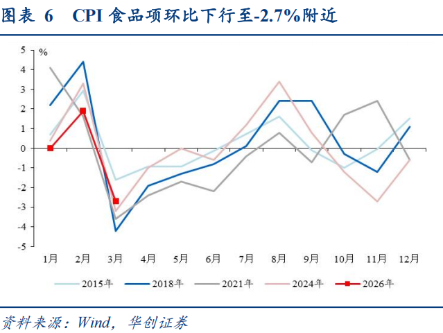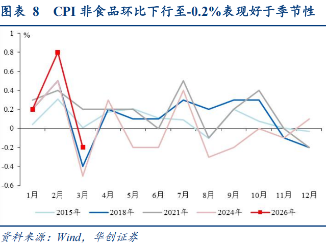 3月CPI非食品项环比下行至-0.2%,带动CPI下行约0.17个百分点。
