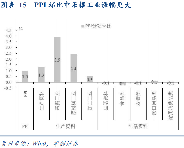 3月PPI环比涨幅上涨至1%,采掘业依旧为涨价主导部门。3月生产资料价格上行1.3%(+0.8pct),其中采掘工业价格上涨3.9%(+2.7pct),原材料工业价格上涨2.4%(+2.2pct),加工工业价格上涨0.5%(-0.1pct),涨价部门依旧为采掘业为主;下游的生活资料价格下降0.1%(-0.1pct),其中食品价格下降0.2%(-0.2pct),衣着价格下降0.1%(+0.3pct),一般日用品价格上涨0.1%(+0.3ct),耐用消费品价格下降0.1%(-0.4pct)。
