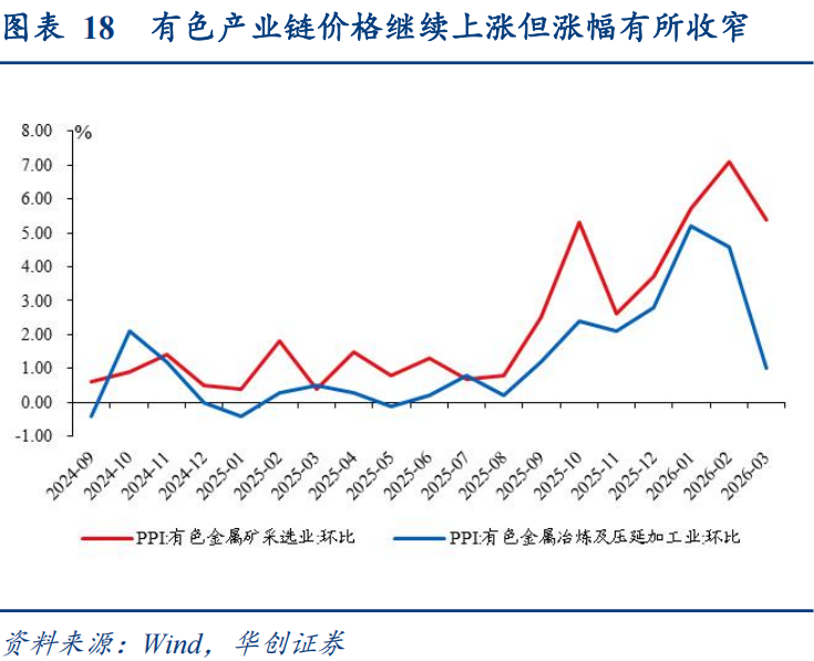 支撑项2:输入性的有色产业链。国际有色金属上行拉动国内相关行业价格上涨,有色金属冶炼和压延加工业价格上涨1.0%,涨幅回落3.6个百分点,其中稀有稀土金属冶炼、铝冶炼价格分别上涨11.8%和0.7%,铜冶炼价格下降1.5%。