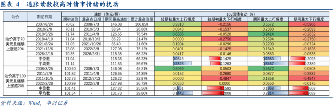 3、若高油价持续债市一般如何反应?历史上经历由“胀”到“滞”的交易。(1)当油价高于70美元且继续上涨超20%时(类似今年3月):历史上共有7轮,债市通常先交易“涨”的影响;(2)当油价高于100美元且继续上涨超20%时(后续情境展望):历史上共有4轮,由于较高油价容易引发全球经济衰退,债市开始更多反应“滞”的影响。