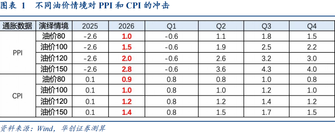 1、根据美伊格局缓解、维持、加剧等情境,假设未来油价中枢分别对应80/100/120/150美元/桶,可对PPI和CPI的走势进行测算: