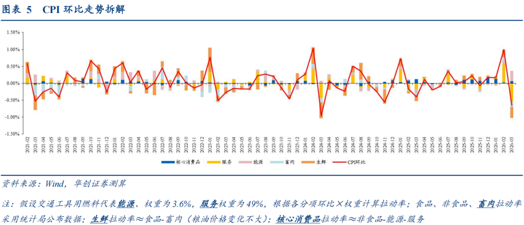 (1)能源:油价上涨,影响CPI上行约0.31pct。2026年3月国际市场原油价格大幅震荡,国内成品油价格采取临时调控措施,调控后汽油价格上涨11.1%,CPI交通工具用燃料价格上涨10%,影响CPI环比上行约0.31个百分点。