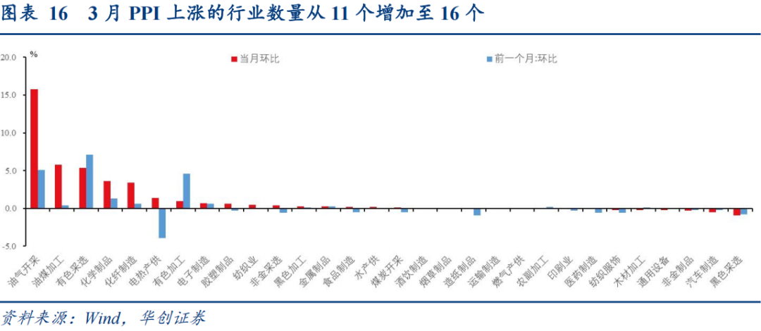 2、分行业:(1)工业生产者行业中价格上涨的行业数量从11个增加至16个。(2)支撑项:输入性的原油和有色产业链,以及节后工业企业、建筑项目逐步复工复产,用能用钢等需求有所回升。